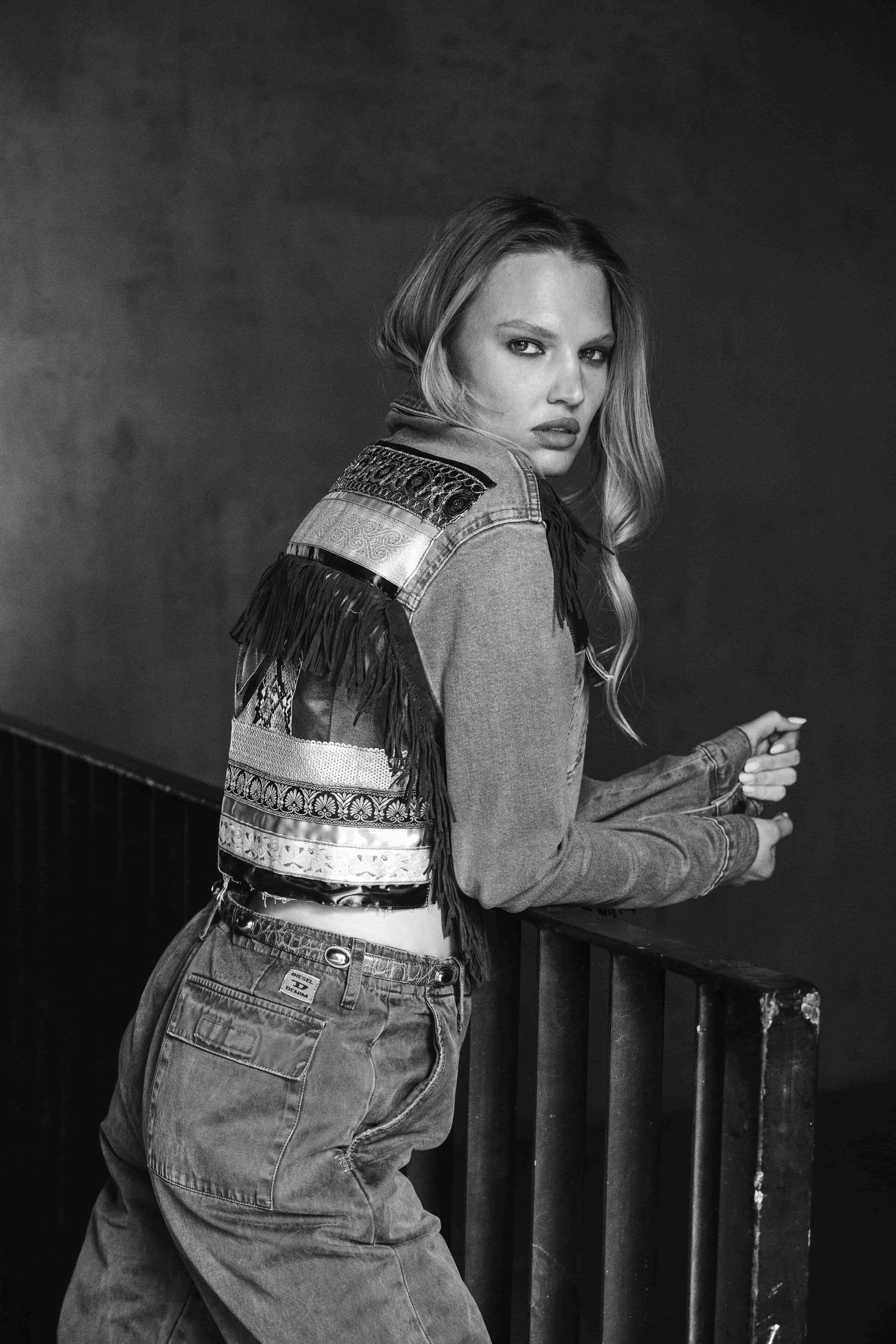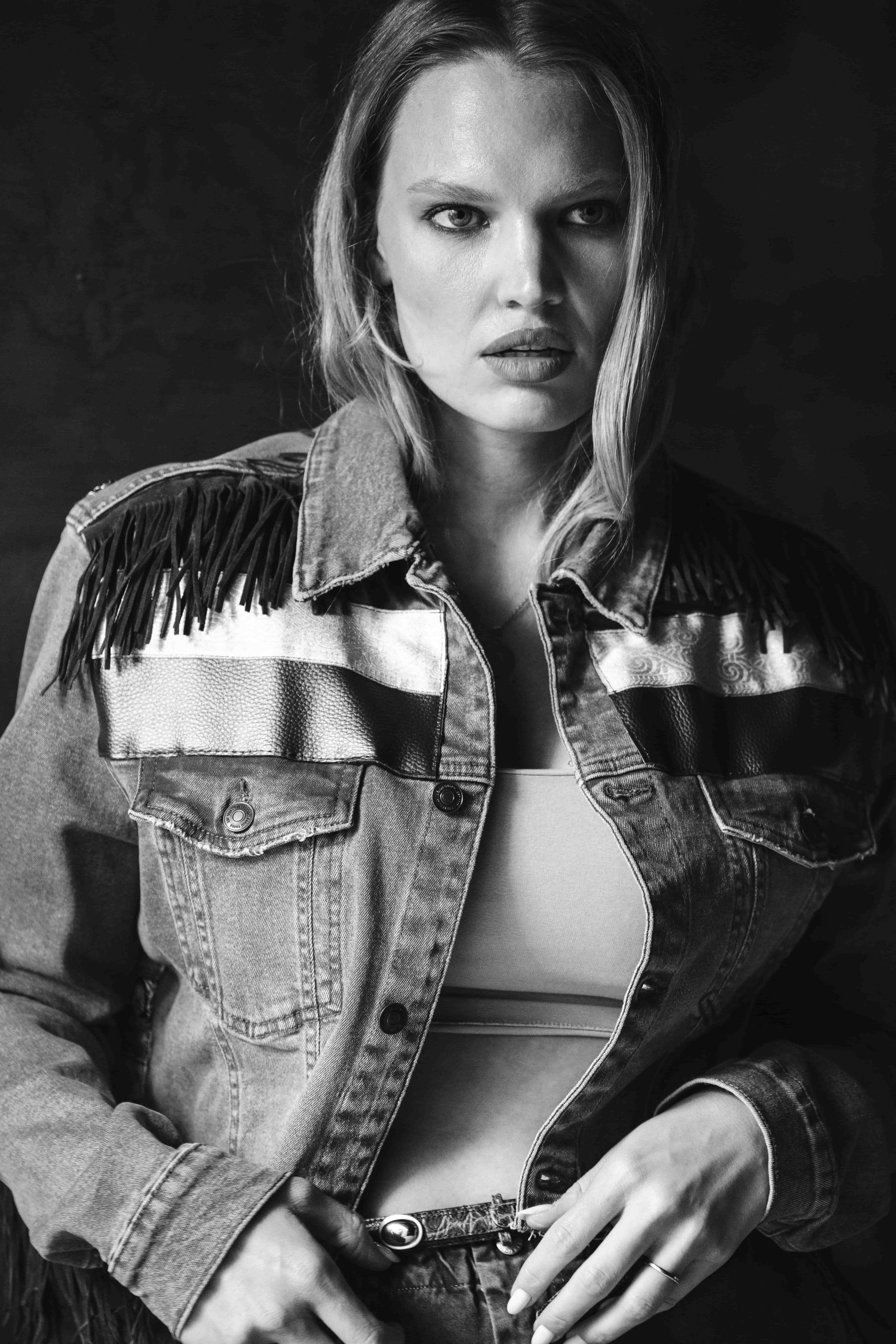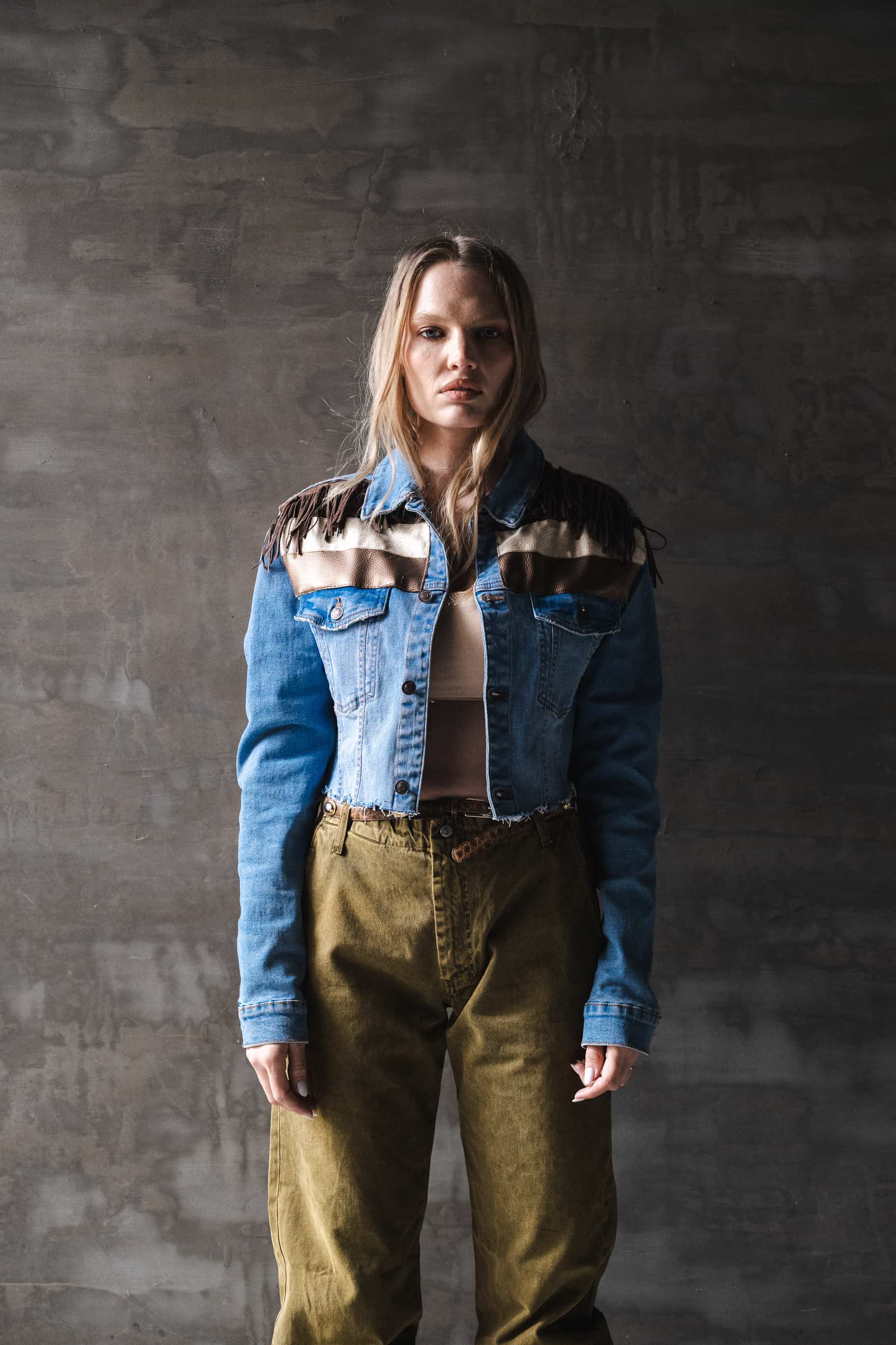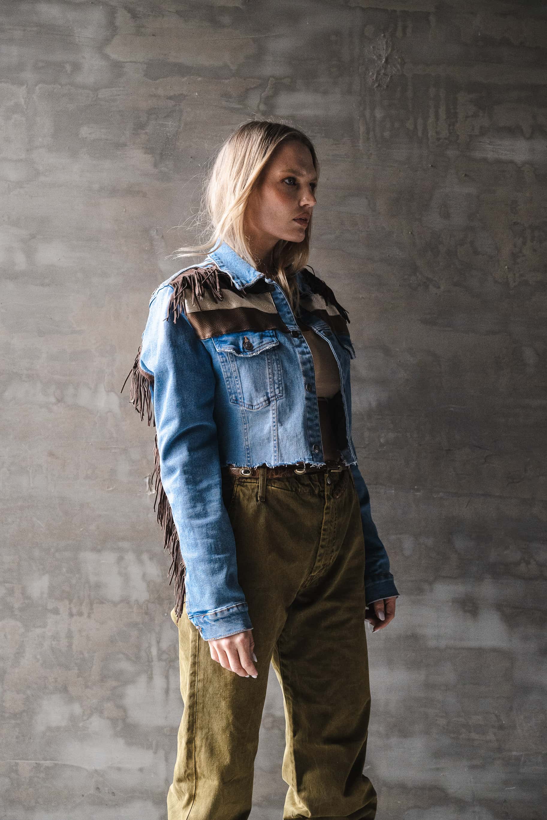 Cropped strih do pása, mäkká riflovina zdobená strapcami z imitácie brúsenej kože.