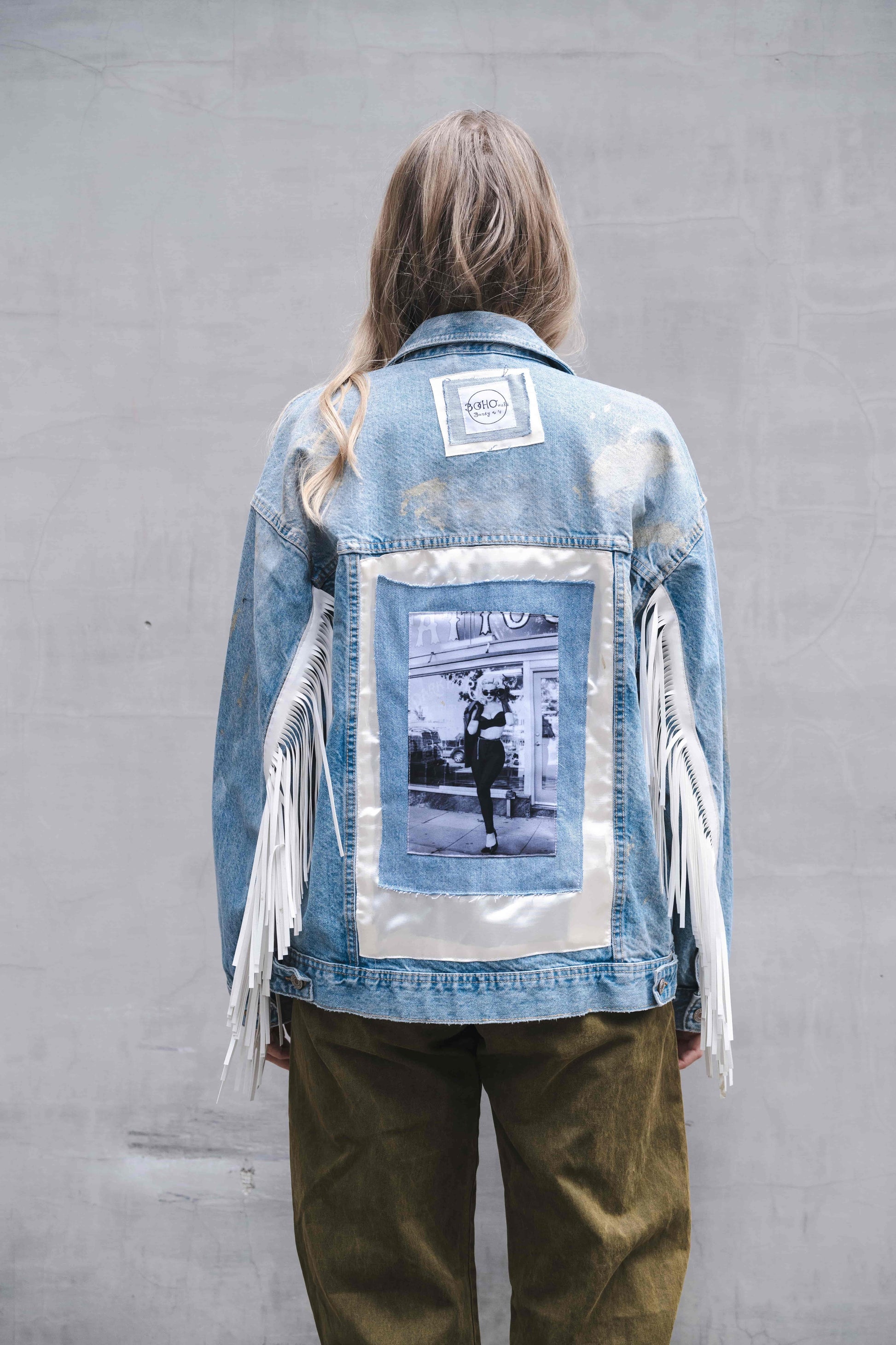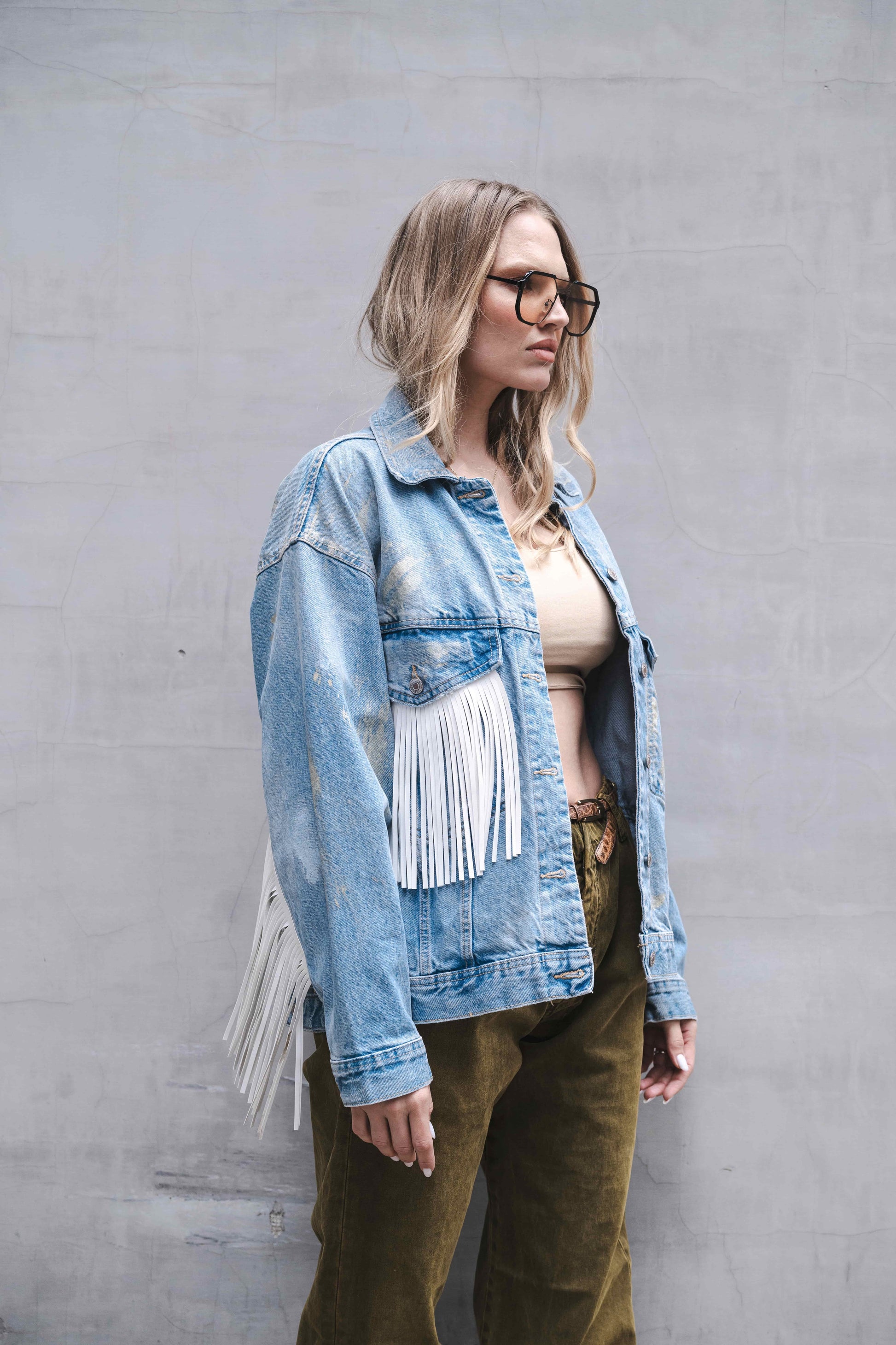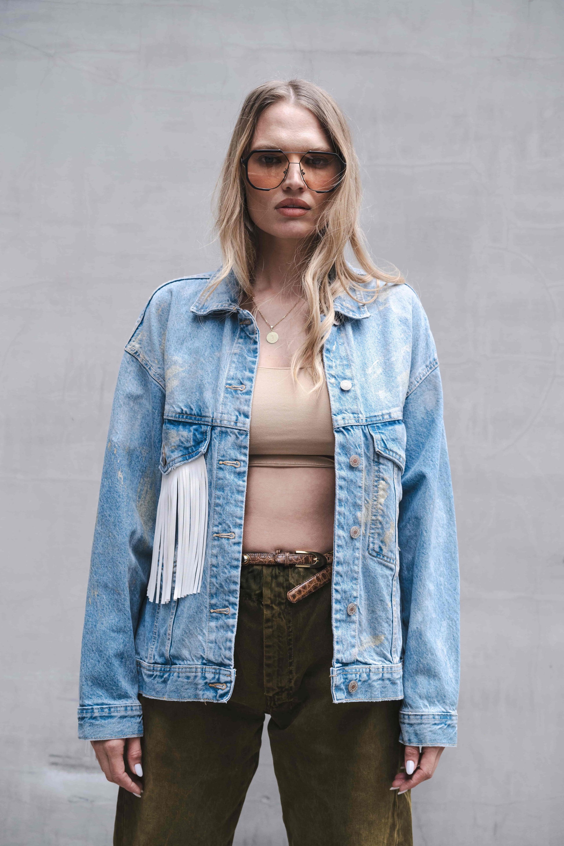 Oversized bunda z mäkkého denimu, dlhé koženkové strapce krémovej farby.