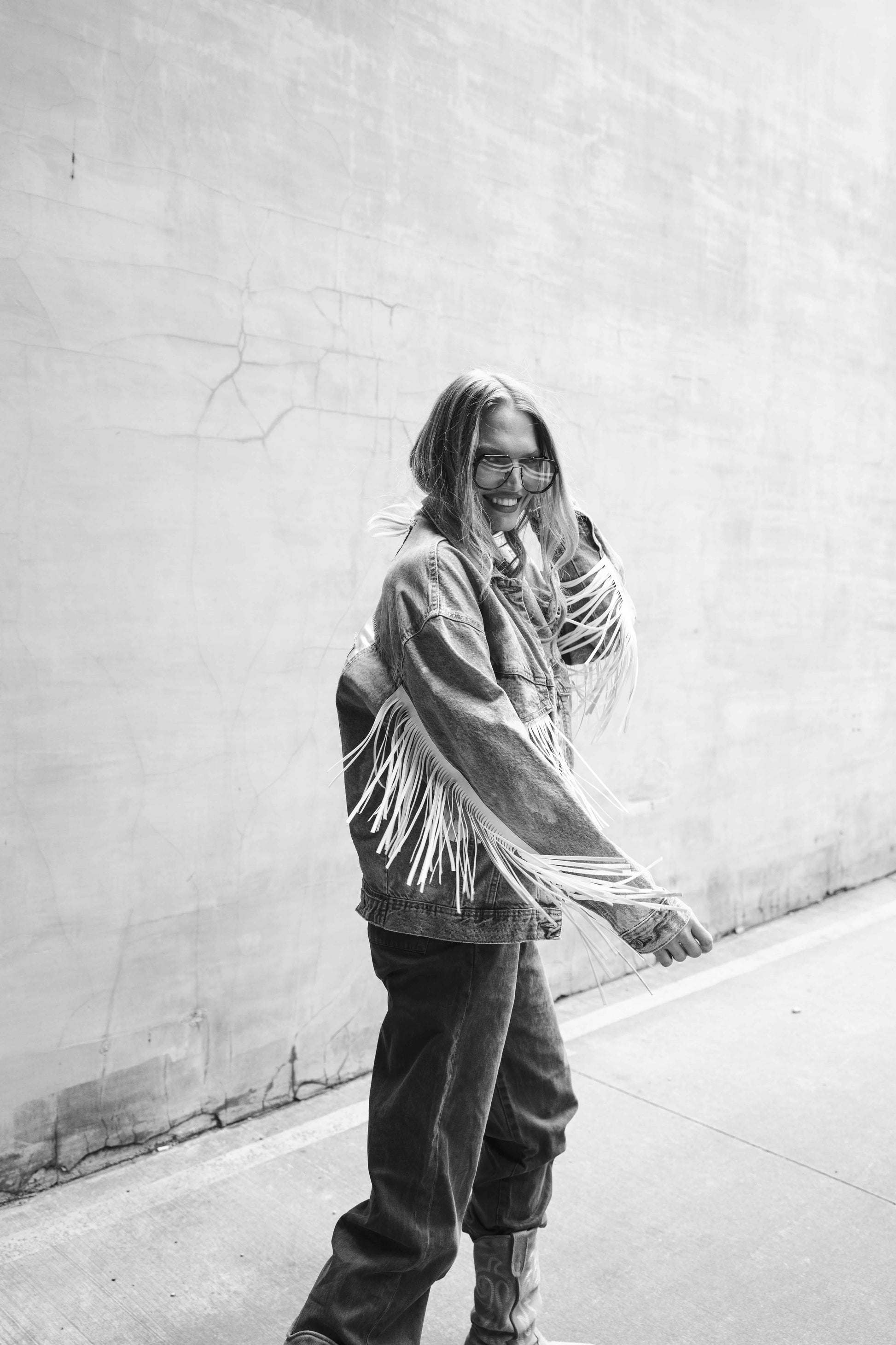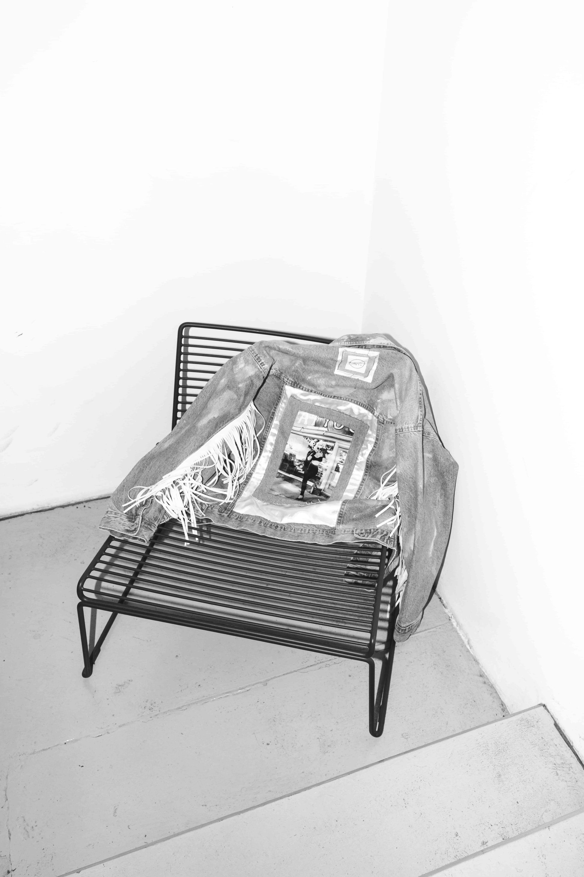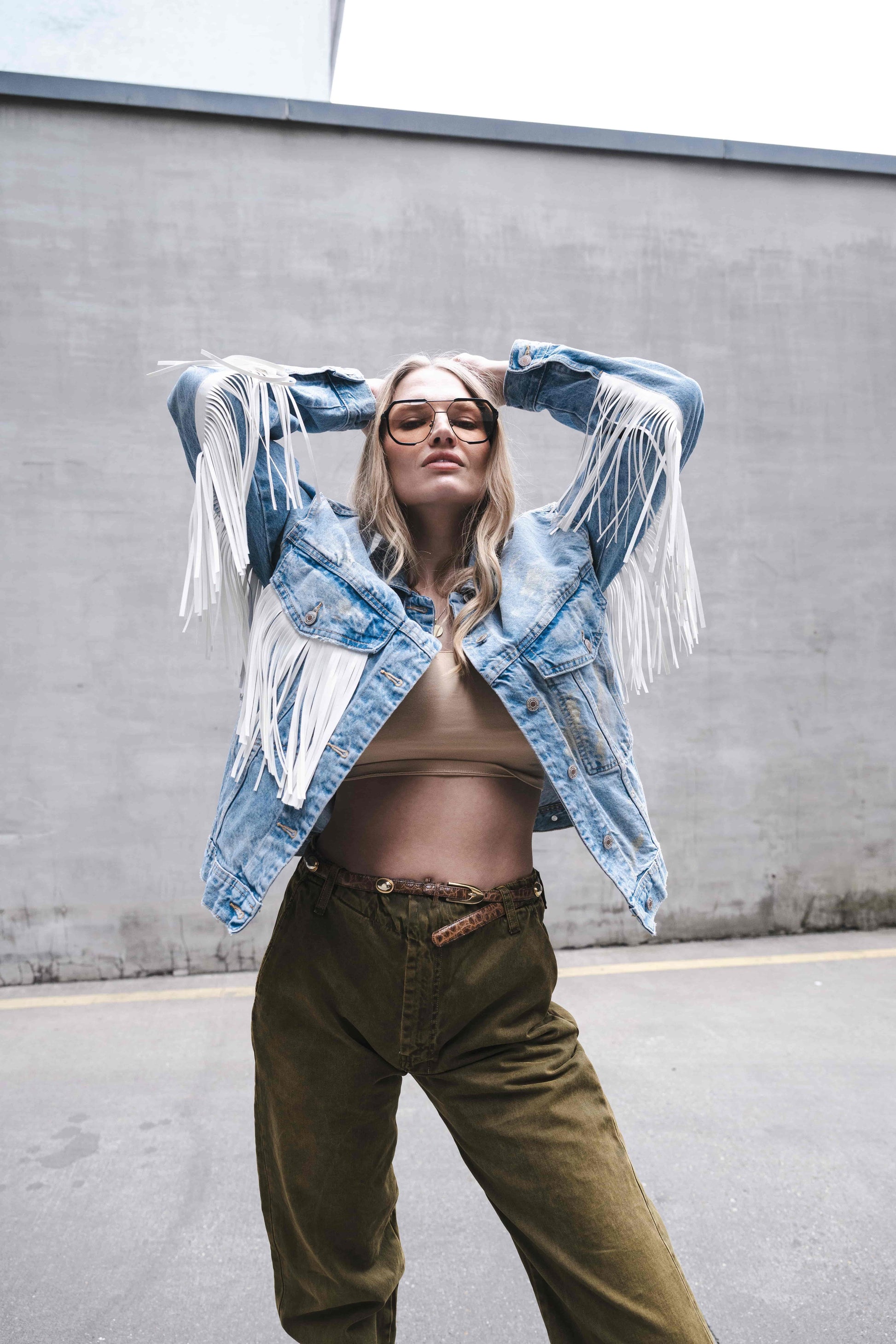 Oversized bunda z mäkkého denimu, dlhé koženkové strapce krémovej farby.