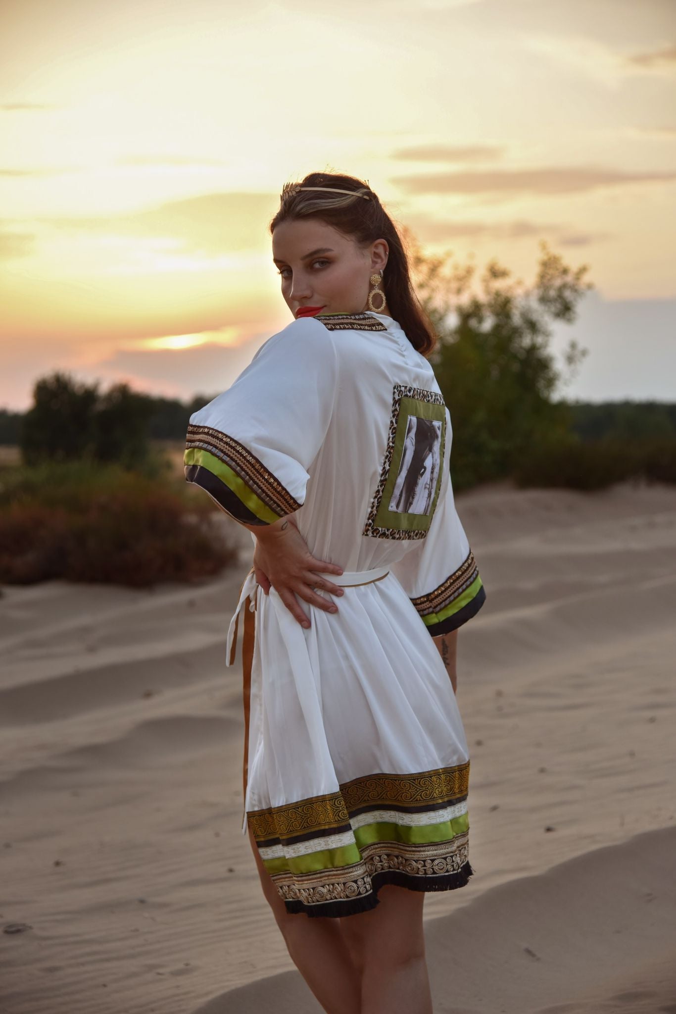 Ručne zdobené jemné kimono, dekorované stuhami, saténom a obrázkami s antickou tematikou.